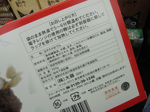 中身はレトルトおでんで、内容物は練り物・大根・コンニャク・昆布・タマゴなど(内容量360g)。