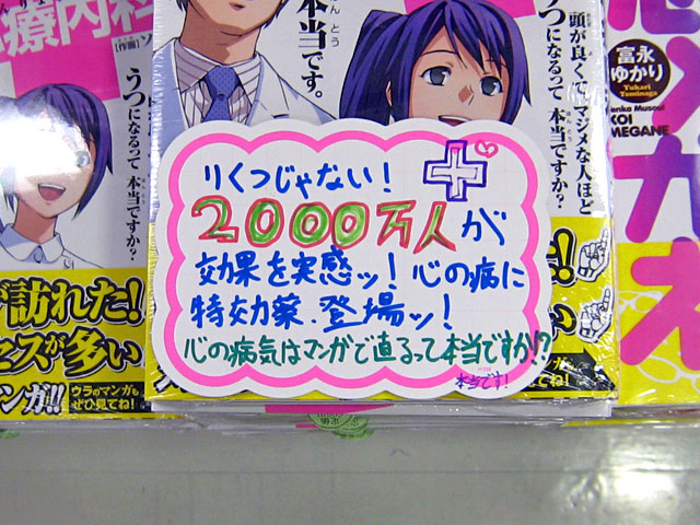 メロンブックスのPOPには『りくつじゃない!2000万人が効果を実感ッ!心の病に特効薬、登場ッ!